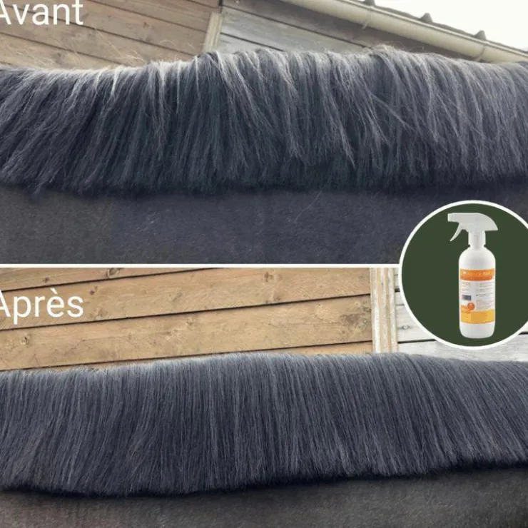Vaporiser le démêlant à 30 cm de la robe, la crinière et la queue en évitant les muqueuses.