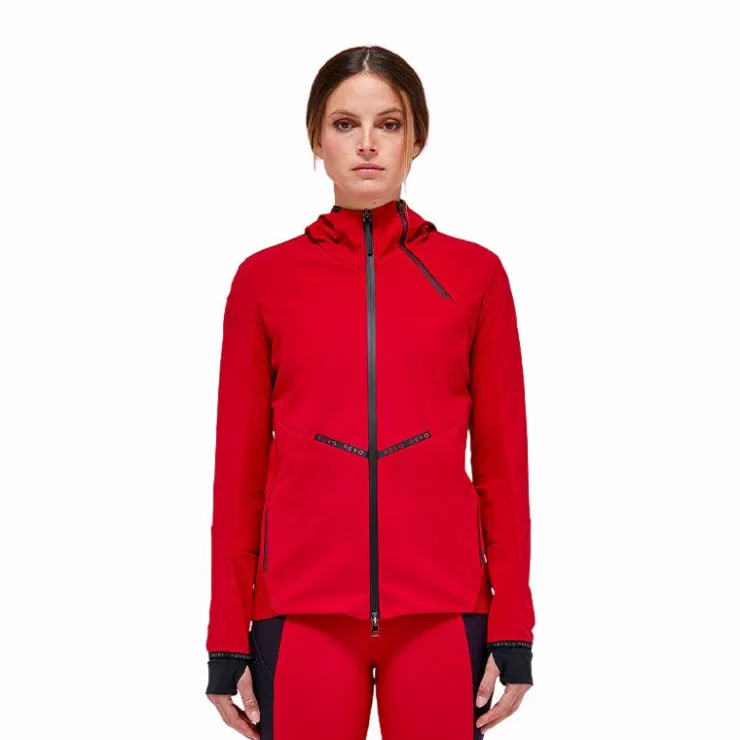 - La capuche amovible, les poches kangourou et la fermeture éclair dans des coutures thermo-activées sont des détails fonctionnels conçus pour offrir un confort lors des activités de plein air, tandis que la bordure en Lycra® à logo imprimé offre une meilleure adhérence et une touche féminine.