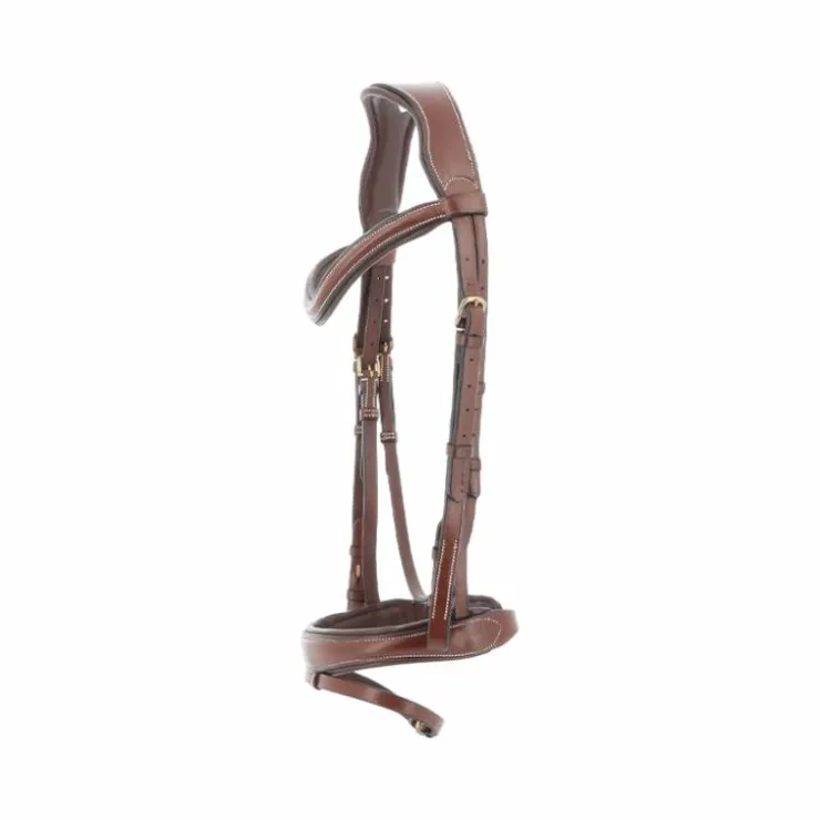 • Bridon en cuir de buffle, têtière anatomique large, frontal en »V » et muserolle combinée doublés cuir vachette matelassé.