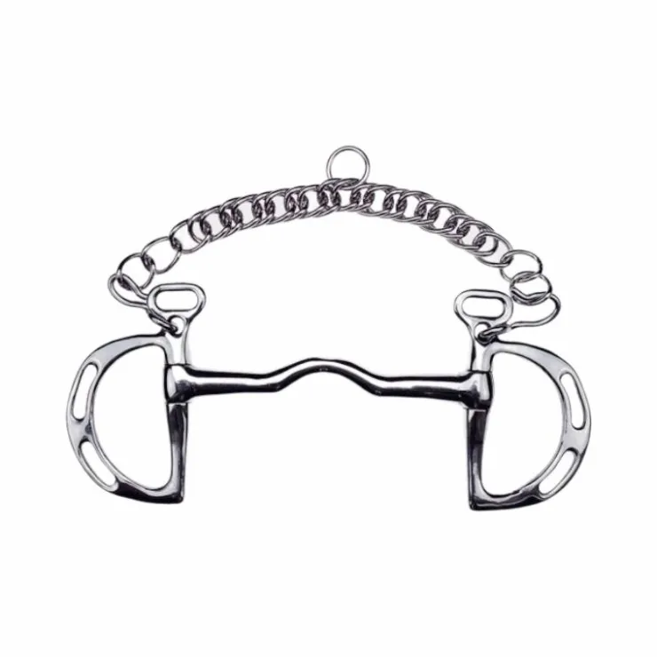 - Le mors Espagnol s’utilise avec une gourmette. Il se présente comme un mors classique mais les anneaux sont en forme de demi-lune, munies d’encoches sur lesquelles on vient fixer les rênes.