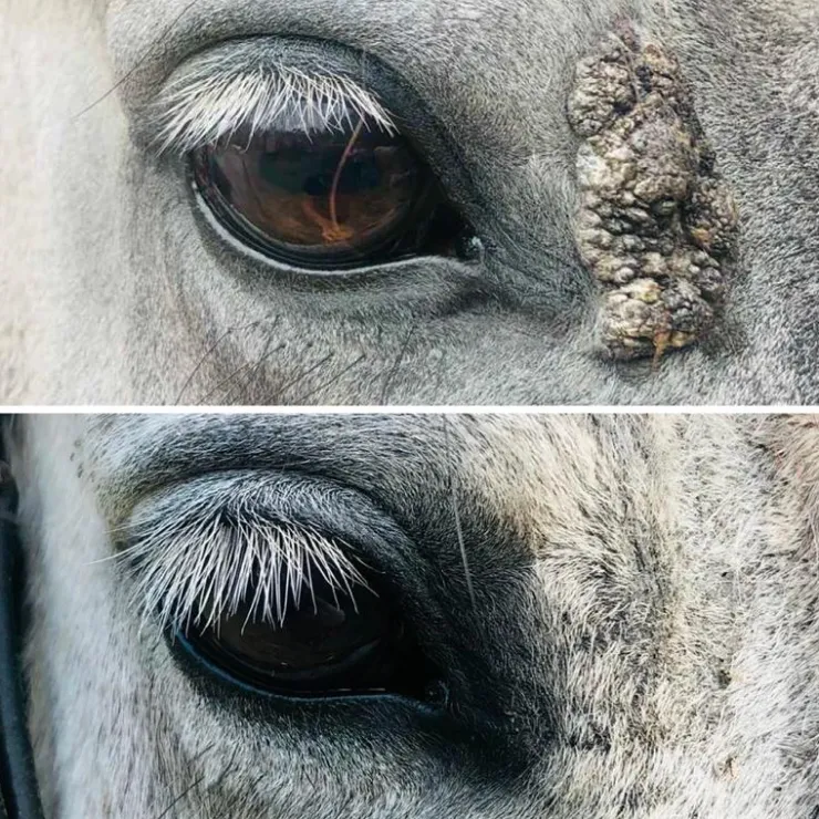 • Provoque une irritation au niveau des tissus atteints afin d’éliminer la verrue, ou la sarcoïde et ainsi arriver à une peau saine