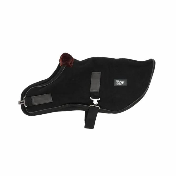 - Fermeture par boucle métallique mâle/femelle au poitrail et ajustement prêt du corps grâce à la sursangle ventrale réglable, fermée par boucle. Des courroies de cuisse élastiquées maintiennent la couverture en place.