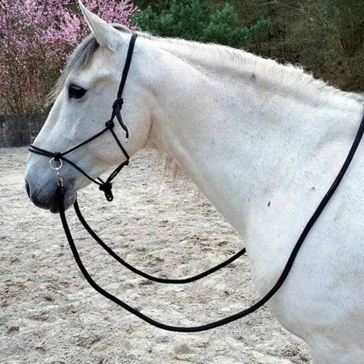 - Licol éthologique pré-noué en polypropylène équipé de 2 anneaux en acier chromé sur la muserolle pour fixer les rênes