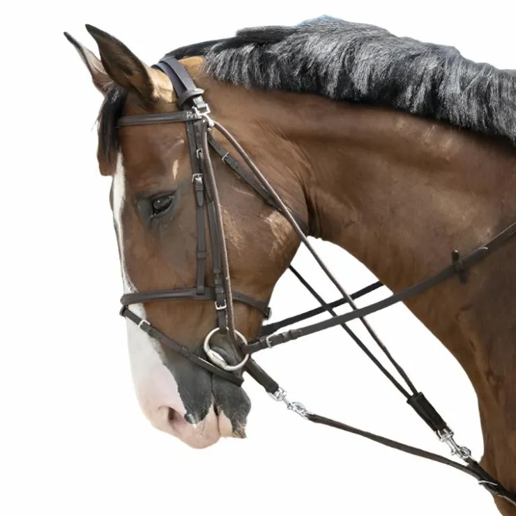 - Comme pour tous les enrênements, il est important de ne pas le régler trop court, particulièrement en début de séance, le but n’étant pas d’emprisonner le cheval ce qui provoquerait des défenses mais de fixer un cadre dans lequel le cheval peut se mettre en place librement.