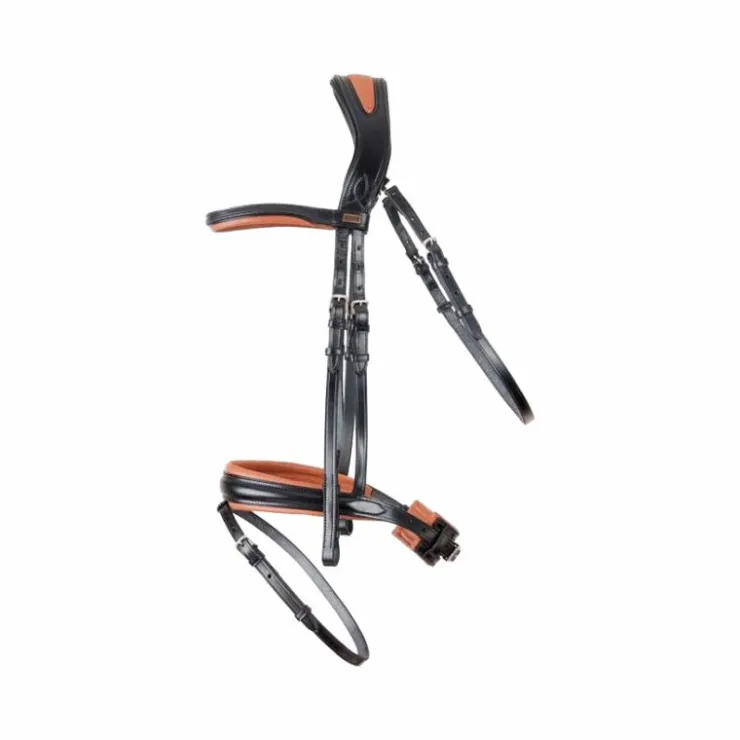 - Bridon à la têtière reculée et large afin de dégager les oreilles et répartir les pressions au niveau de la nuque