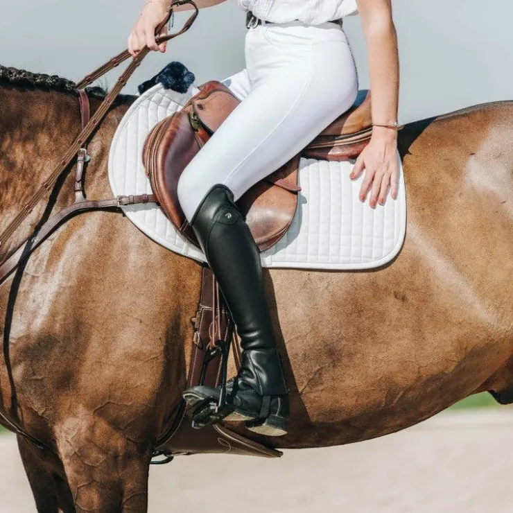 • Élastique à l’arrière de la jambe, les élastiques sous le genou et sous les pieds offrent souplesse et adaptabilité aux mouvements du cavalier