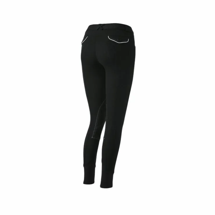 Pantalon d’équitation style maille avec bas de jambe extensible double épaisseur qui facilite l’enfilage et garantit un positionnement fixe sans aucune gêne.Coupe droite près du corps avec fond découpé et basanes tissu. Poches cavalières avant et poches plaquées arrière imbriquées dans le fond.
