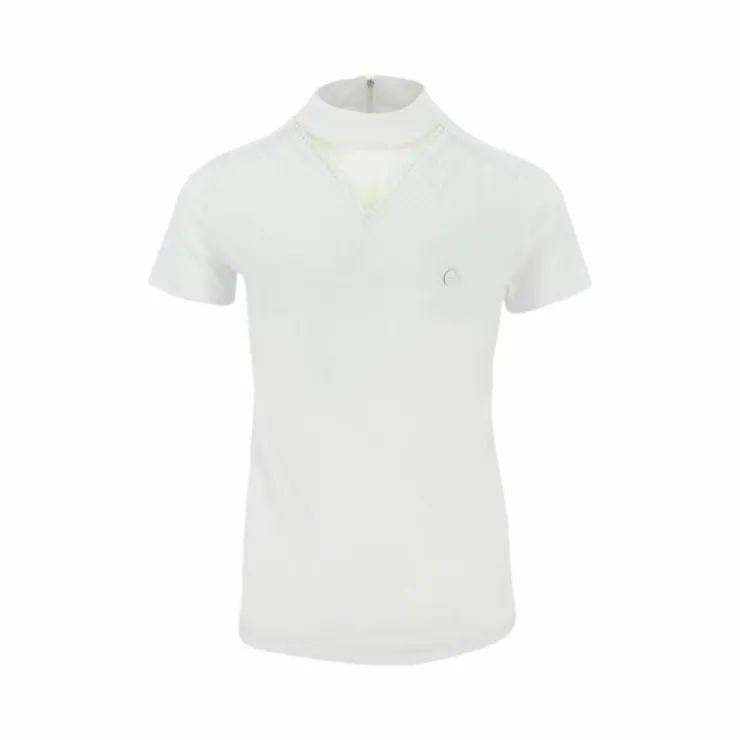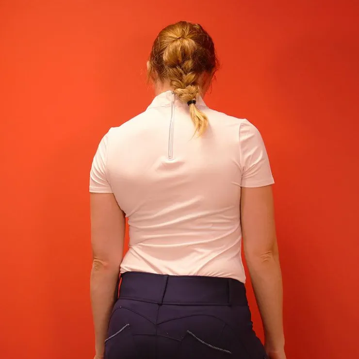 J’ai un vrai coup de cœur pour ce polo ! Sa finition triangle est très jolie, avec une dentelle très fine qui laisse passer la transparence du décolleté. La fermeture du col se fait dans la nuque. Ici porté en taille S.
