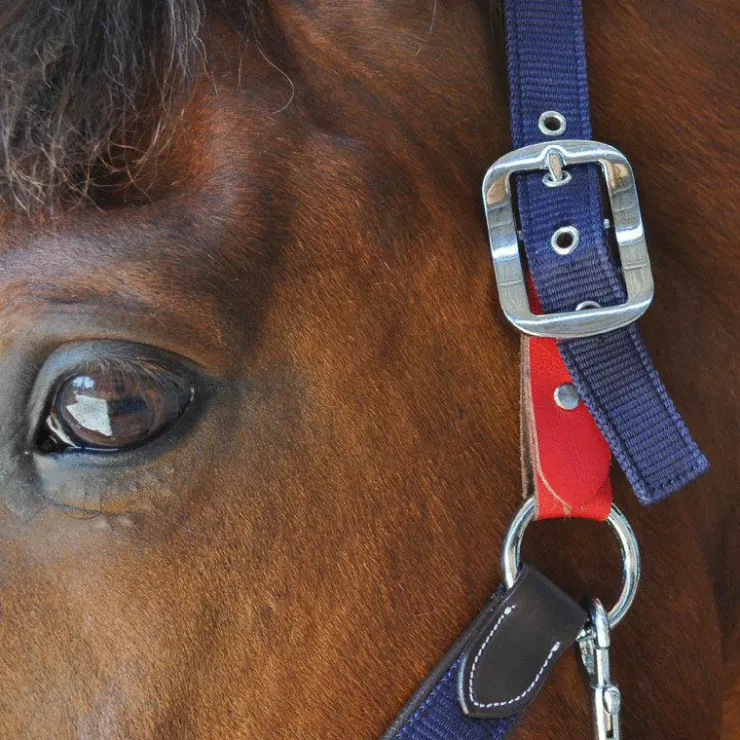 - Le licol de sécurité Flags&Cup est muni d’une têtière avec courroie de sécurité en cuir rouge, prévue pour casser lorsque que le cheval tire au renard et que la pression est trop forte