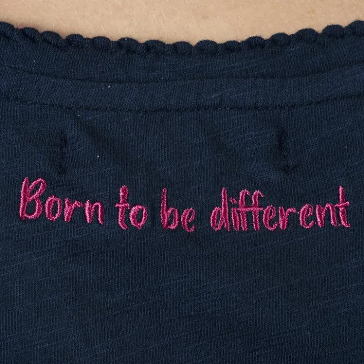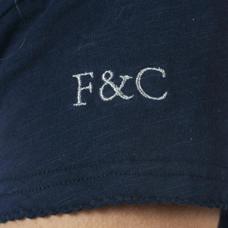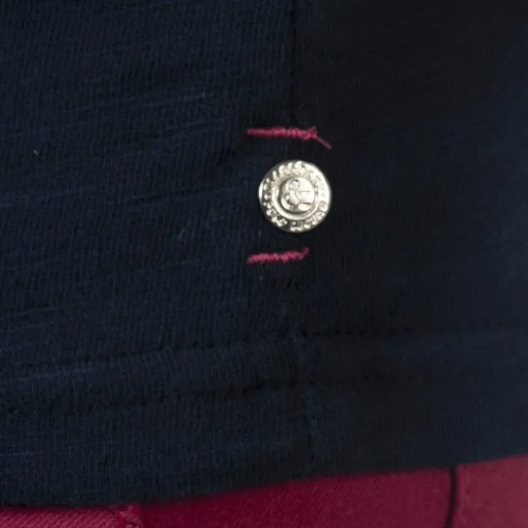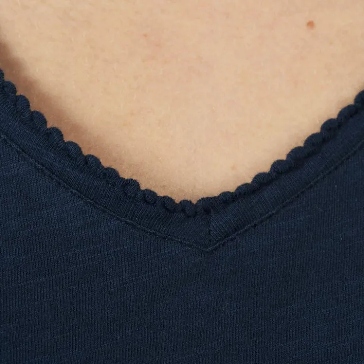 - Le bas des manches courtes est bordé d’une finition croquet