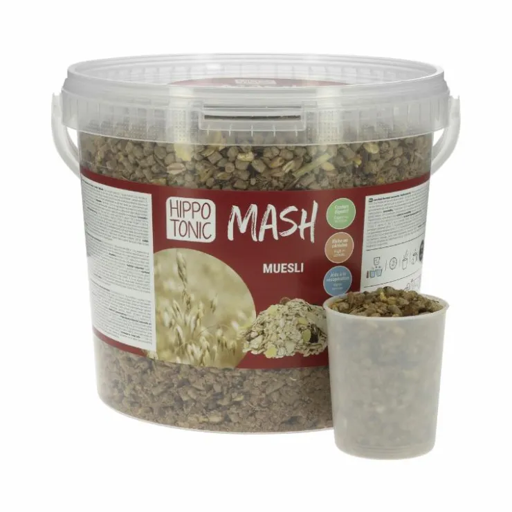 • Mélanger dans un seau le mash à de l’eau chaude (1 volume de mash pour 2 volumes d’eau), laisser infuser environ 15 minutes avant de donner le mash encore tiède à votre cheval pour favoriser la bonne digestion et nettoyer l’intestin