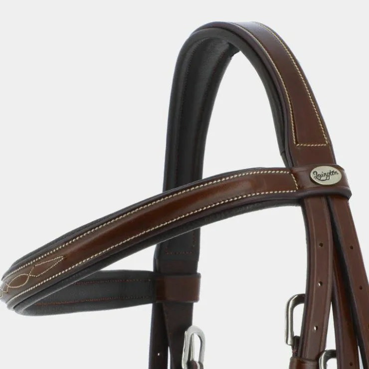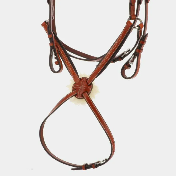 - Frontal et muserolle 1/2 rond, doublés et surpiqués. Têtiere anatomique doublée. Bouclerie inox. Livré avec rênes eventer.