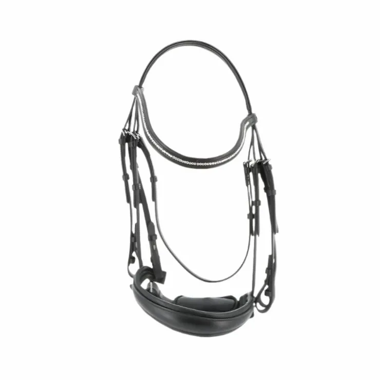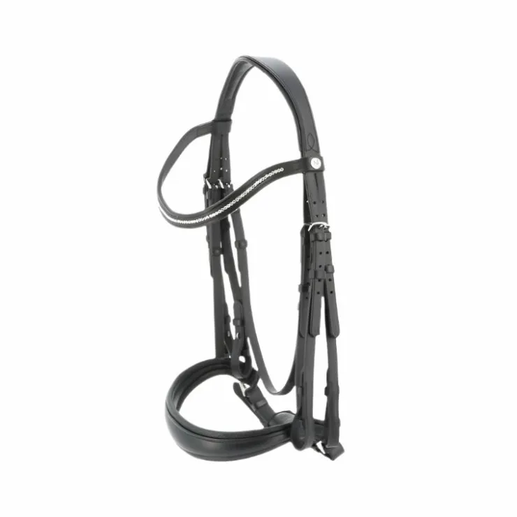- Bride en cuir de buffle avec têtière et muserolle souple doublées cuir vachette, frontal avec incrustation de strass.