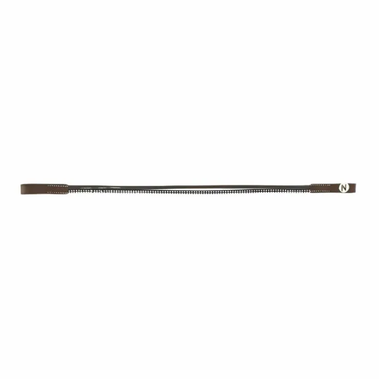 - Frontal en cuir de buffle avec deux lanières : une en polyuréthane aspect cuir vernis et une en polyester ornée de petits clous brillants.