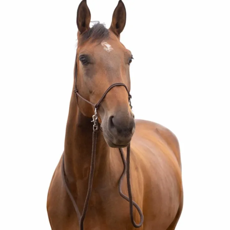 - Licol éthologique pré-noué en polypropylène équipé de 2 anneaux en acier chromé sur la muserolle pour fixer les rênes