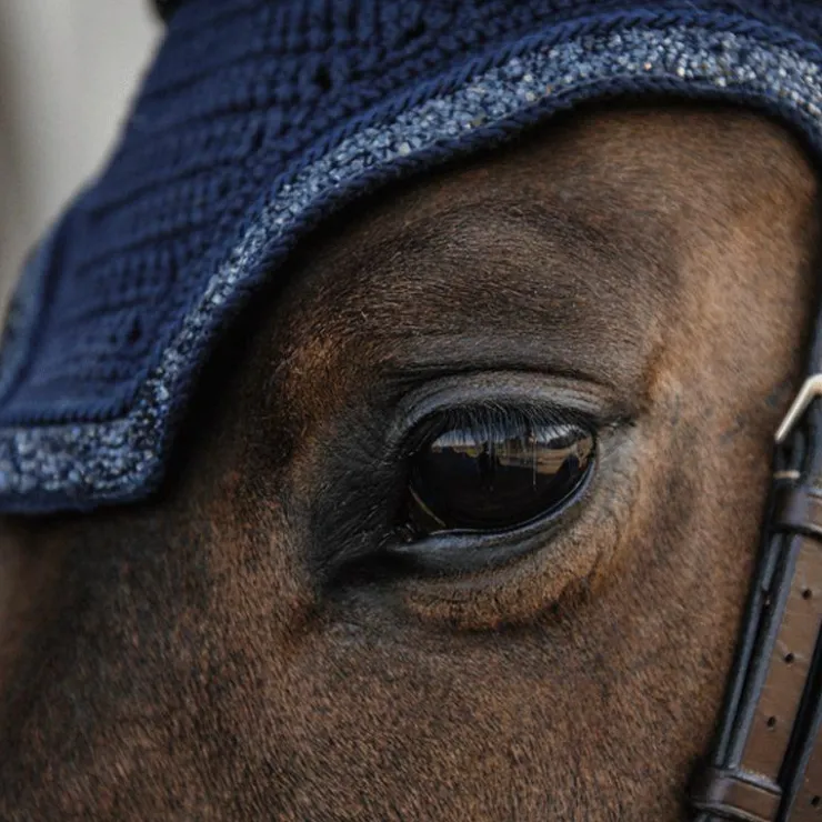 - Tissu autour des oreilles extensible et ajusté. Il protège les oreilles du cheval contre les mouches et le bruit pendant le travail.