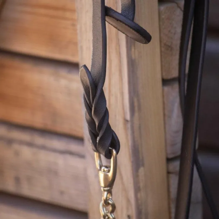 • À l’autre extrémité, deux chaînes dorées dotées de deux mousquetons permettent de tenir le cheval sur le côté droit et gauche du mors
