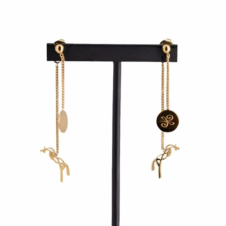 - Cette paire de boucles d’oreilles pendantes baptisée Yuna est composée d’une double pendentif au bout desquels on trouve le petit logo Pénélope et une petite plaque ronde sur lequel on trouve l’arabesque, symbole de l’amitié.
