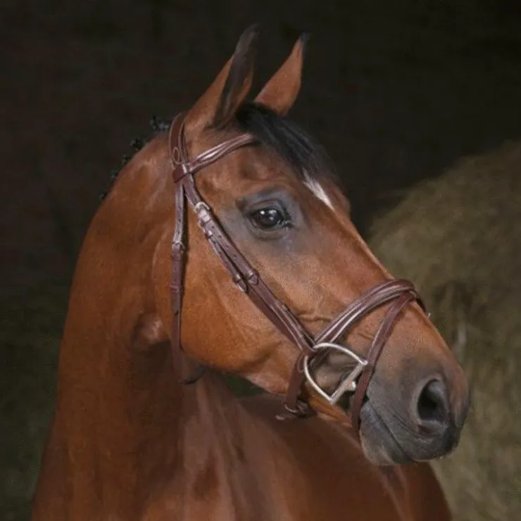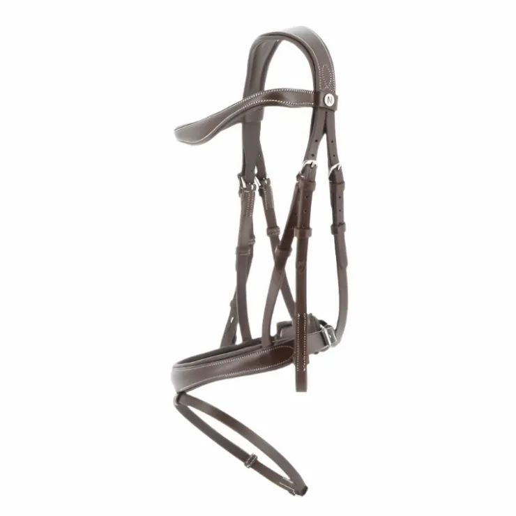 - Bridon en cuir de buffle avec têtière, frontal et muserolle doublés cuir vachette, crochets sur les montants de mors