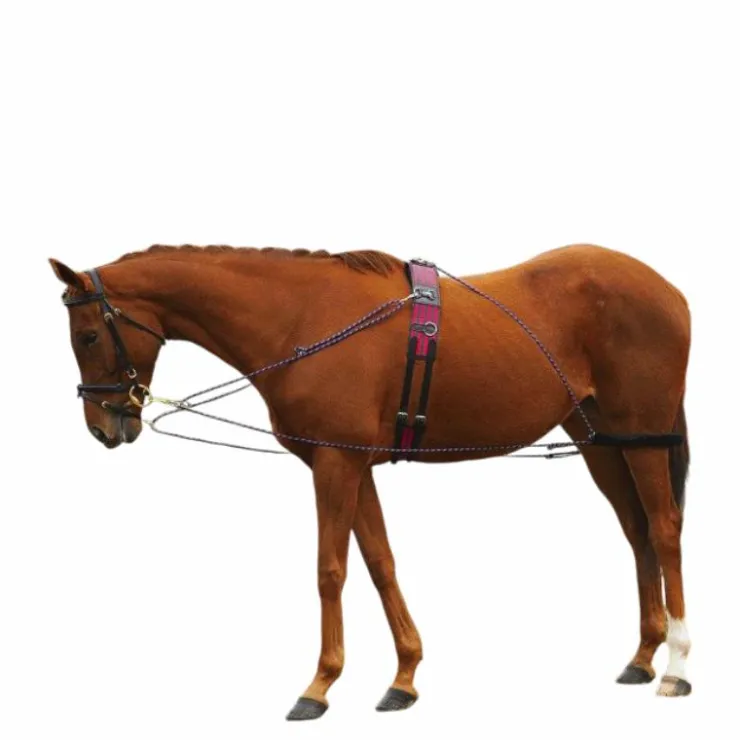 - Un enrênement très complet qui favorise à la fois une bonne tenue de l’avant-main, une grande mobilité du dos et l’engagement des postérieurs du fait de son système à poulies et de son attache sur la partie supérieure du surfaix.