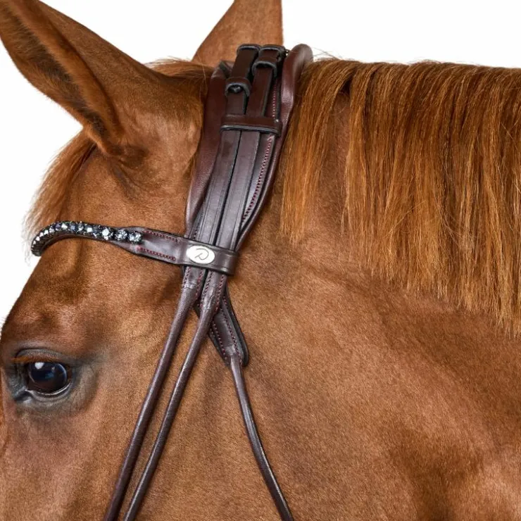 • Doté d’une muserolle large rembourrée ainsi qu’un frontal en V orné de cristaux Swarovski gris
