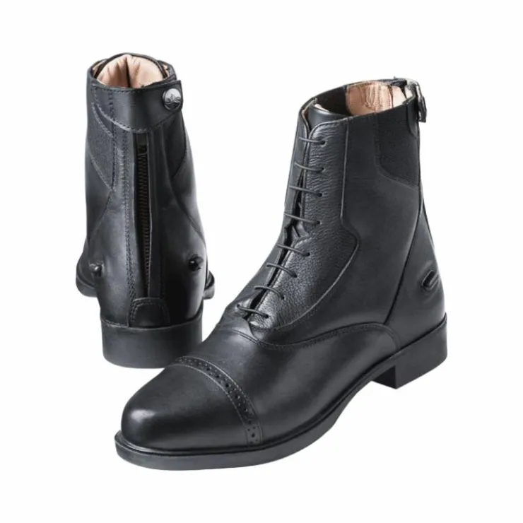 - Taquets d’éperon latéraux. Première en mousse dessus textile, doublure cuir de chèvre, semelle en caoutchouc