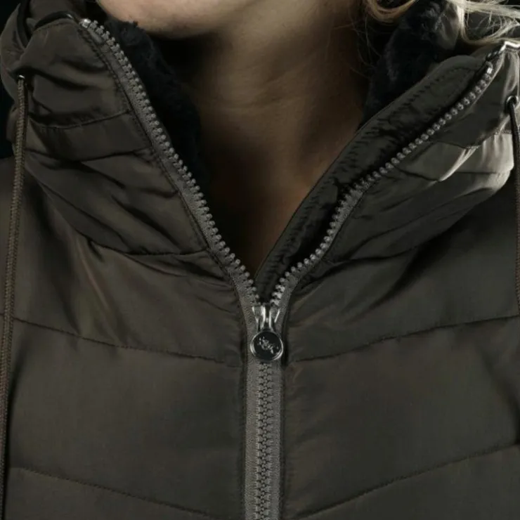 • Côté détail, on apprécie le large zip avant qui se termine par un col haut galonné de cuir synthétique et doublé de fourrure synthétique toute douce