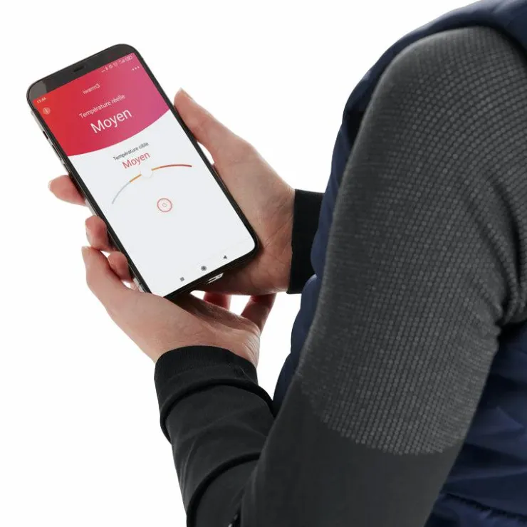 • La technologie s’active via un bouton situé sur le côté de la veste. La température se module sur le bouton ou via l’application « iwarm3 » téléchargeable sur smartphone