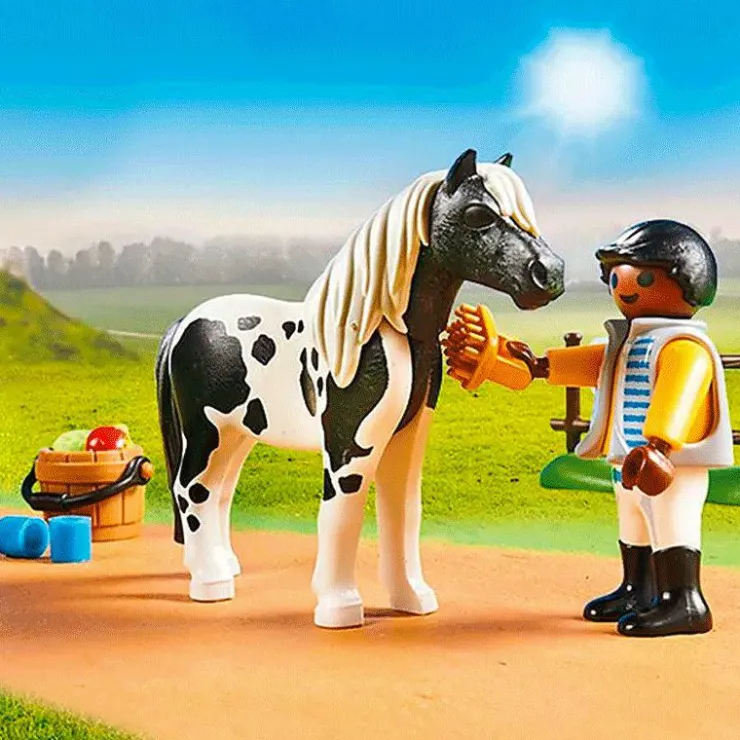 - Le petit garçon prend bien soin de son poney Lewitzer. La boîte bleue contient plusieurs accessoires pour ce dernier.