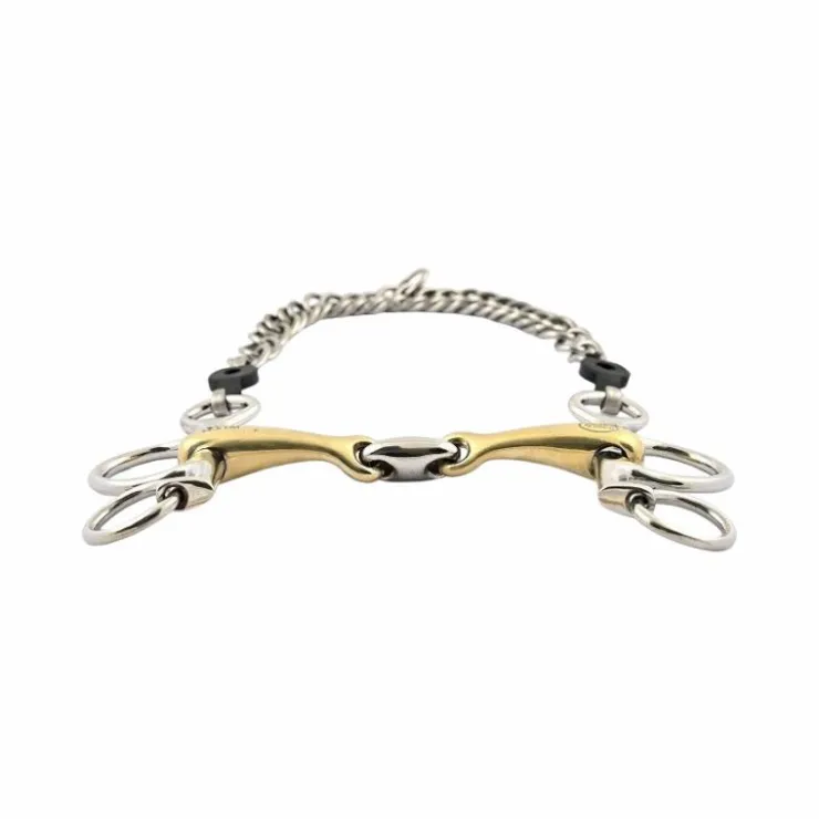 - La brisure centrale est en inox afin de bloquer le mors dans une forme anatomique lors de l’action de la main. Permettant ainsi une action plus forte en cas de très forte prise de contact