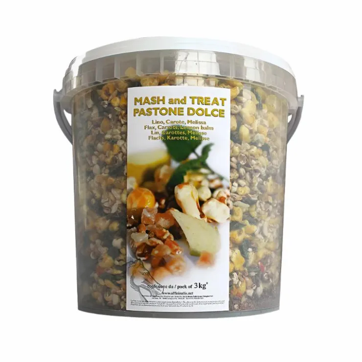 - Composition : farine de son de blé, flocons d’orge, blé soufflé, farine de lin précuite, maïs soufflé, carottes en petits morceaux, mélisse officinalis