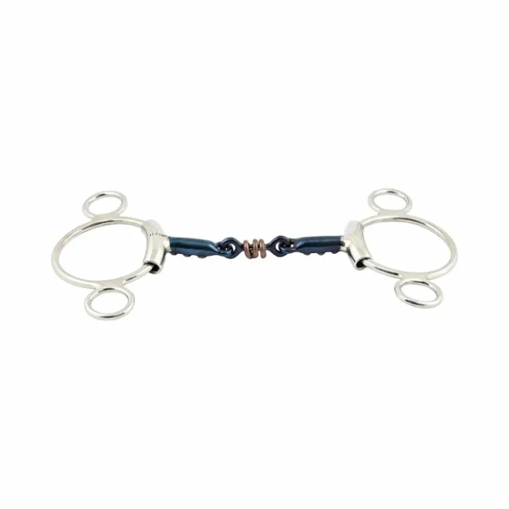 - Canon un peu plus fort qu’une double brisure classique, les incrustations cuivre vers la bouche du cheval et les anneaux centraux permettent de détendre le cheval plus facilement