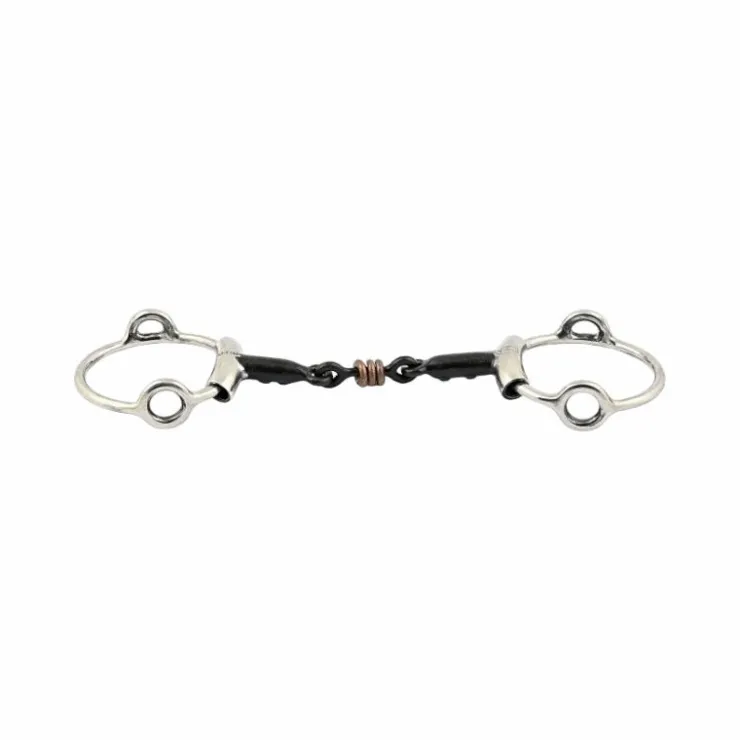 - Canon un peu plus fort qu’une double brisure classique, les incrustations cuivre vers la bouche du cheval et les anneaux centraux permettent de détendre le cheval plus facilement