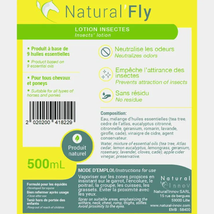 - Natural’Fly est recommandé en alternative aux produits chimiques pour neutraliser l’odeur du cheval.