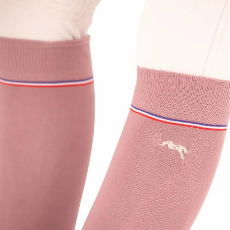 • Une paire en croisillon crème sur fond rose poudré et une paire rose poudré unie avec un liseré bleu blanc rouge.