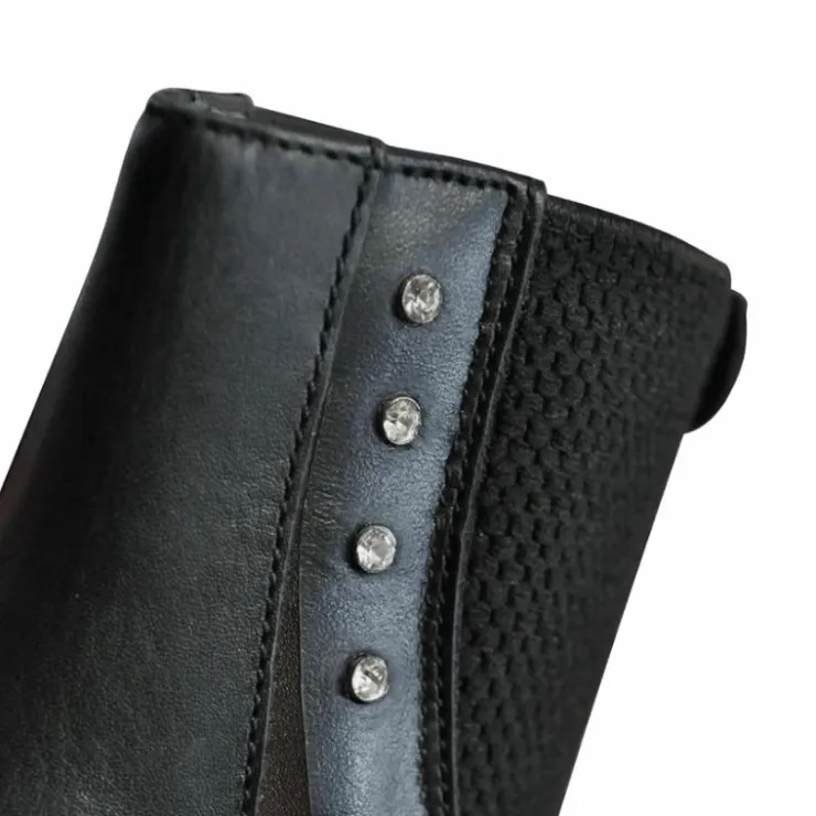 - Liserés de cuir contrasté et petits strass