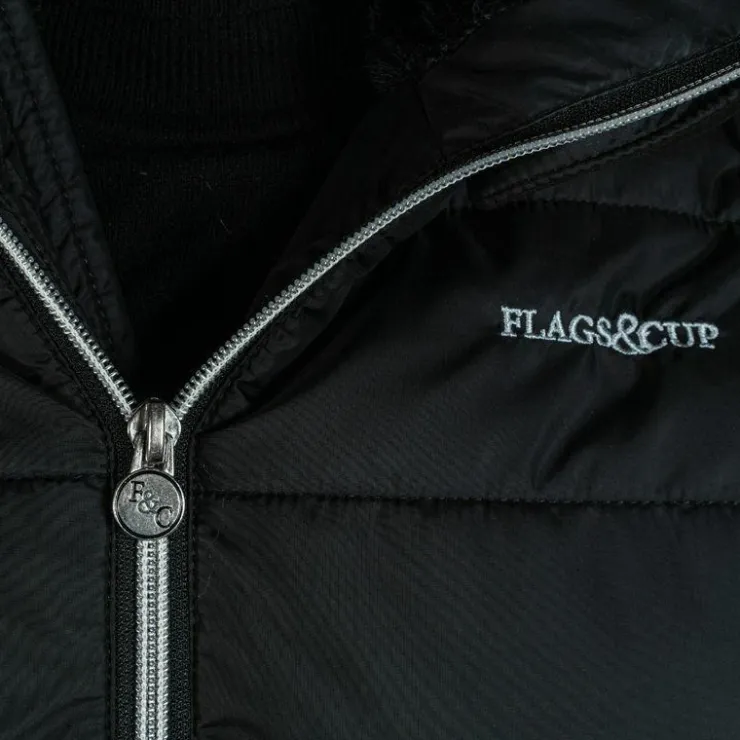 - Fermeture frontale zip argenté double curseur avec tirettes F&C métalliques. Deux poches à l’avant zippées sous rabat avec tirette F&C métallique. Une poche poitrine intérieure zippée. Broderie Flags&Cup argentée sur cœur