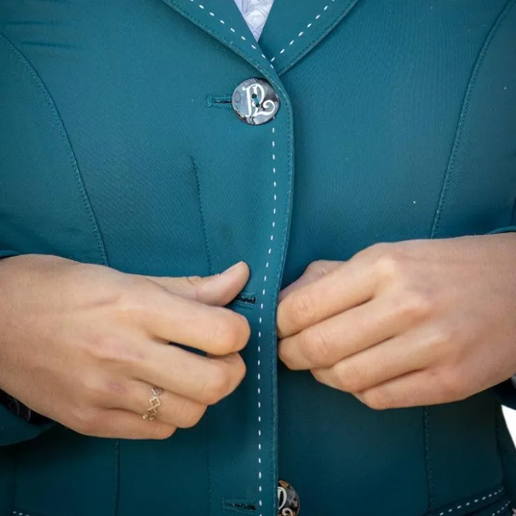 - Mêmes détails, surpiqûres crème tout le long de la veste, 3 boutons marqués des initiales « PL », 2 fausses poches à l’avant et une coupe féminine.